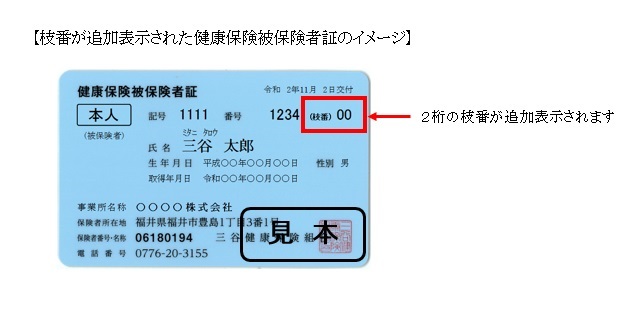 令和3年3月からマイナンバー(社会保障・税番号)制度によるオンラインでの健康保険資格確認の運用が予定されております。これにより、令和2年10月1日に健康保険法施行規則等の一部を改正する省令が公布され、被保険者証等の様式改正がされたことに伴い、当健康保険組合では令和2年11月1日以降に発行する健康保険被保険者証の表面に「個人を識別する2桁の枝番(以下枝番)」が追加表示されることになりましたので、お知らせいたします。