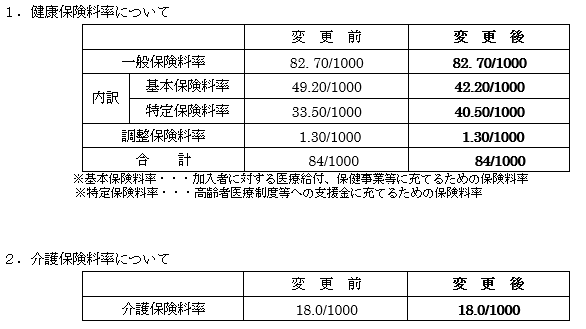 健康保険料率は内訳の変更で、合計保険料率に変更はなく、介護保険料率についても変更はありません。