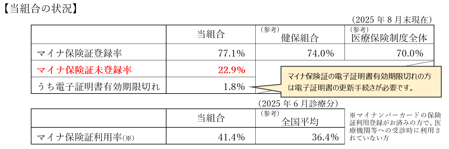 つきましては、2025年10月31日までに、被保険者ご本人分およびご家族分も含めて、マイナンバーカードの保険証利用登録をお願いします。また、保険証利用登録はお済みの方でマイナ保険証で医療機関等を受診されたことが無い方は、今後受診の際はご利用いただきますようお願いします。